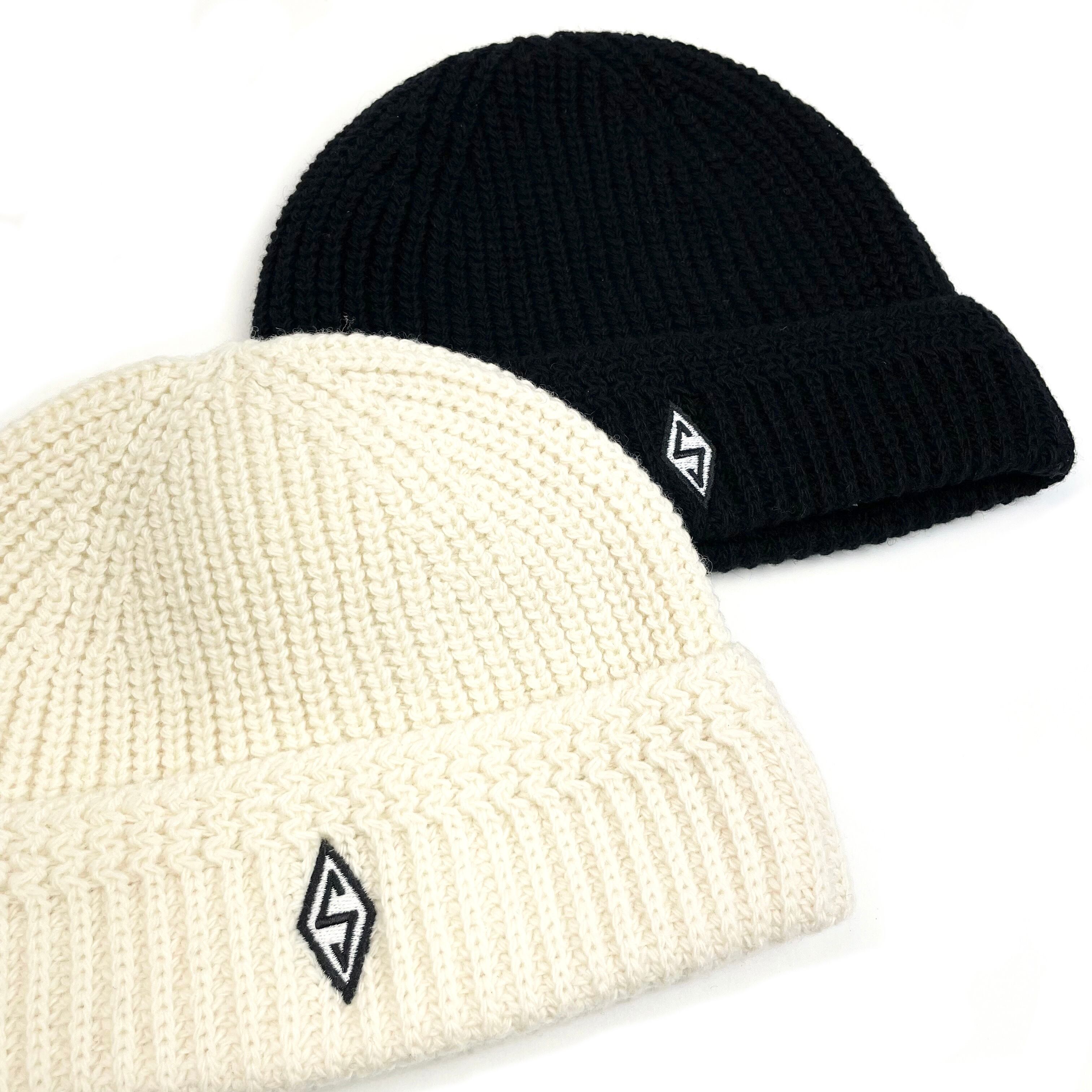 手編みのような太番手のゲージで、折り返し部分の矢振り編み部下にDiamond Logo刺繍。